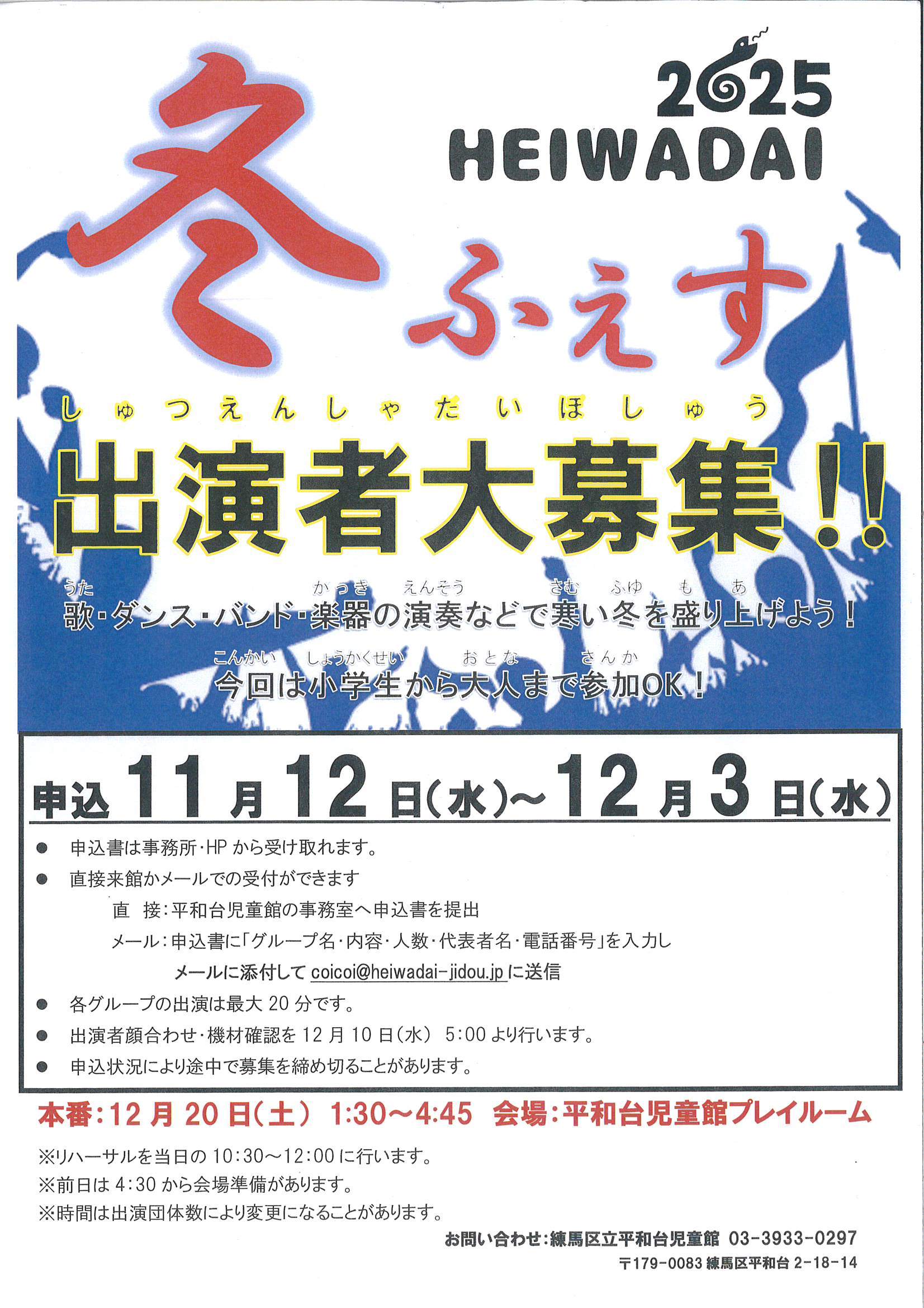 | 今年も平和台児童館をご利用いただき、ありがとうございました。 平和台児童館は12月29日から2026年1月3日までお休みします。 1月4日は9:00から通常通り開館します。 2026年もどうぞよろしくお願いいたします。 |